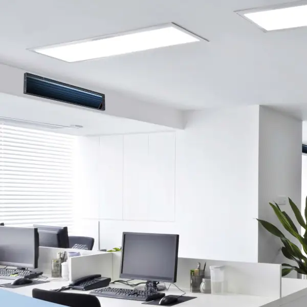 Su diseño moderno permite una instalación flexible en pared baja o techo, adaptándose estéticamente al ambiente sin perder funcionalidad.